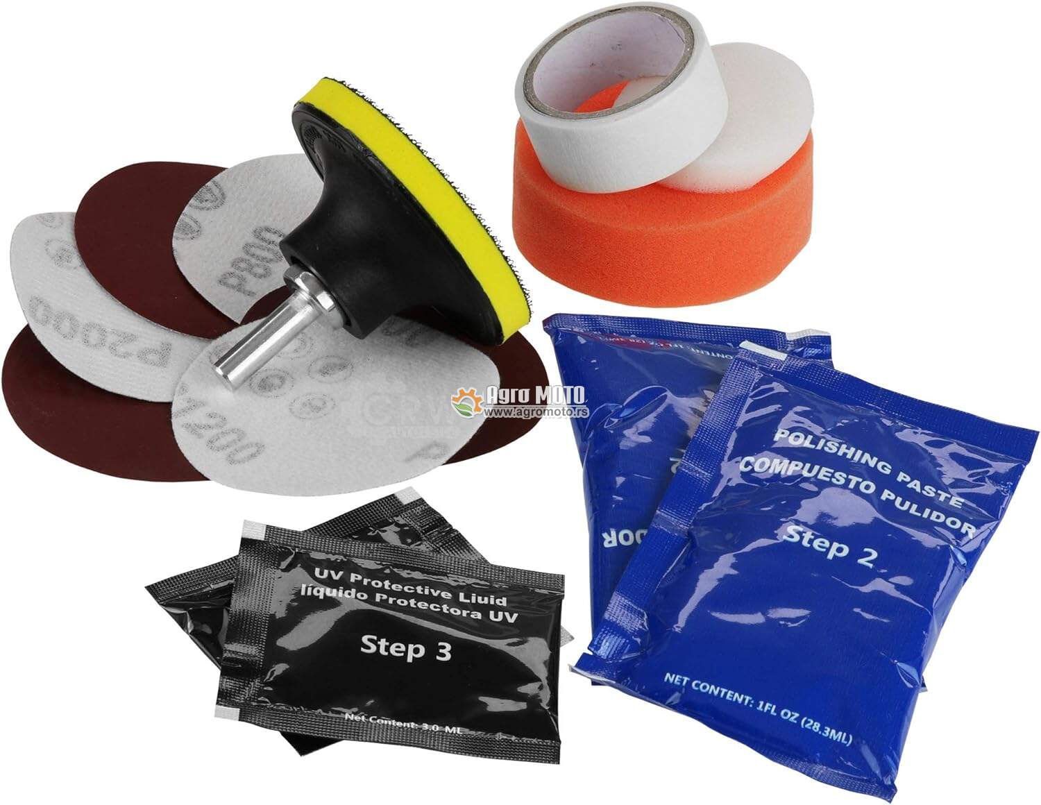 - Sadržaj: Brusni disk, brusni papir (800, 1200, 2000), polirna pasta, nano UV zaštita, traka za zaštitu, polirni i završni sunđer