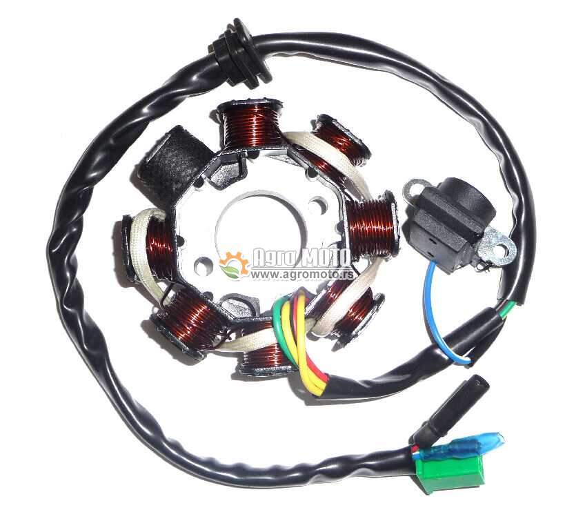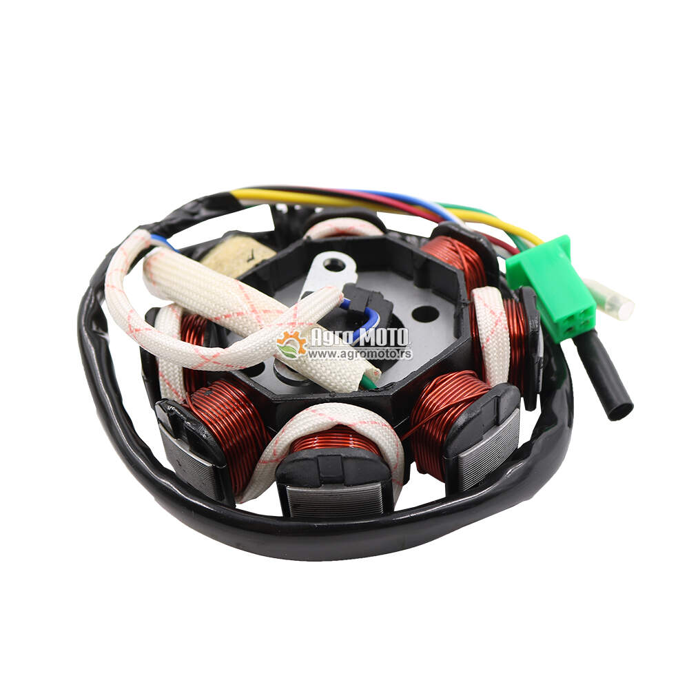 Ploča paljenja visokog kvaliteta, namenjena za kineske četvorotaktne (4T) skutere zapremine 50cc, 125cc i 150cc sa GY6 motorima. Ovaj stator sadrži 8 namotaja, uključujući 1 pobudni namotaj, čime obezbeđuje stabilno napajanje i efikasan rad celokupnog električnog sistema skutera.