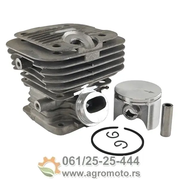 Komplet cilindar sa klipom i karikama fi 42 mm za Dolmar i Makita testere izrađen je prema originalnoj tehničkoj specifikaciji motora ove serije. Komplet uključuje sve što je potrebno za kompletan remont cilindra bez dodatnih narudžbi: cilindar od legure aluminijuma, klip od livenog aluminijuma, dve kompresione karike, iglični ležaj klipnjače i sigurnosne cirklere (osigurači bolcne). Prečnik bore od tačno 42 mm osigurava savršeno prijanjanje uz zidove cilindra i punu kompresiju, što je ključno za pouzdan rad benzinskog dvotaktnog motora testere.