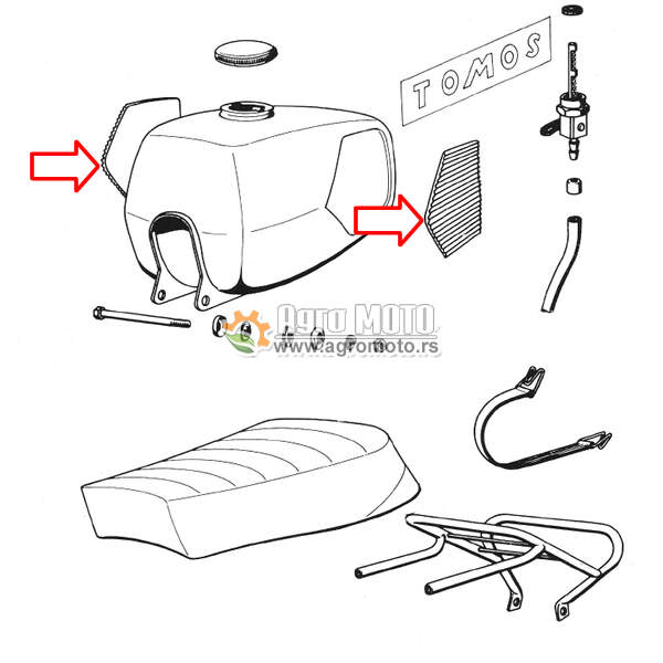 Ovaj proizvod predstavlja par (levi i desni) bočnih guma za rezervoar goriva, ključnih za restauraciju i funkcionalnost klasičnih modela Tomos motocikala. Deo je na dijagramu jasno označen strelicama i poznat je pod nazivima jastučići za kolena ili harmonika gume rezervoara.