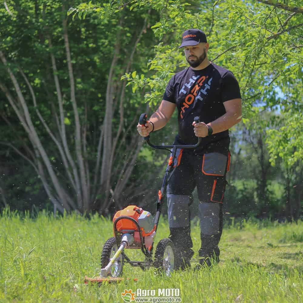Motorni trimer na točkovima TH520WBC 1,9KS Thorp predstavlja revolucionarno rešenje za košenje trave koje kombinuje snagu profesionalnog trimera sa mobilnošću i udobnošću kolica. Ovaj inovativni uređaj posebno je dizajniran za korisnike koji traže efikasno košenje bez fizičkog opterećenja leđa, ramena i ruku, što ga čini idealnim izborom za starije osobe, rekonvalescente ili bilo koga ko želi lako i brzo održavanje travnjaka. Sa snažnim motorom od 1,9 konjskih snaga i zapreminom cilindra od 51,7 cc, ovaj trimer pruža profesionalne performanse uz maksimalnu ergonomiju.