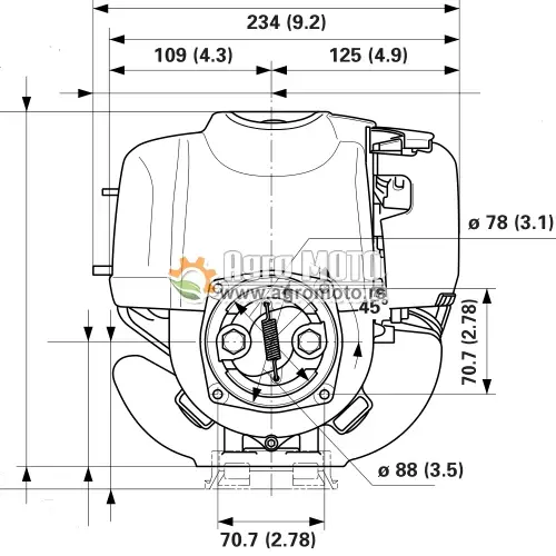 Ovaj ugradni motor GX35 dimenzijski je identičan originalnom Honda GX35 motoru, što ga čini direktnom zamenom na svim uređajima projektovanim za taj motor. Montažna prirubnica, raspored montažnih otvora i dimenzije izlaznog vratila identični su originalnim Honda GX35 specifikacijama. Konekcija na gredu trimera vrši se standardnom centrifugalnom kvačicom koja dolazi uz motor — proverite prečnik cevi i tip spojnice na vašem trimeru pre ugradnje. Uz novi motor za trimer GX35 dostupni su i svi rezervni delovi: karburator, elektronika, cilindar i klip za Honda GX35.