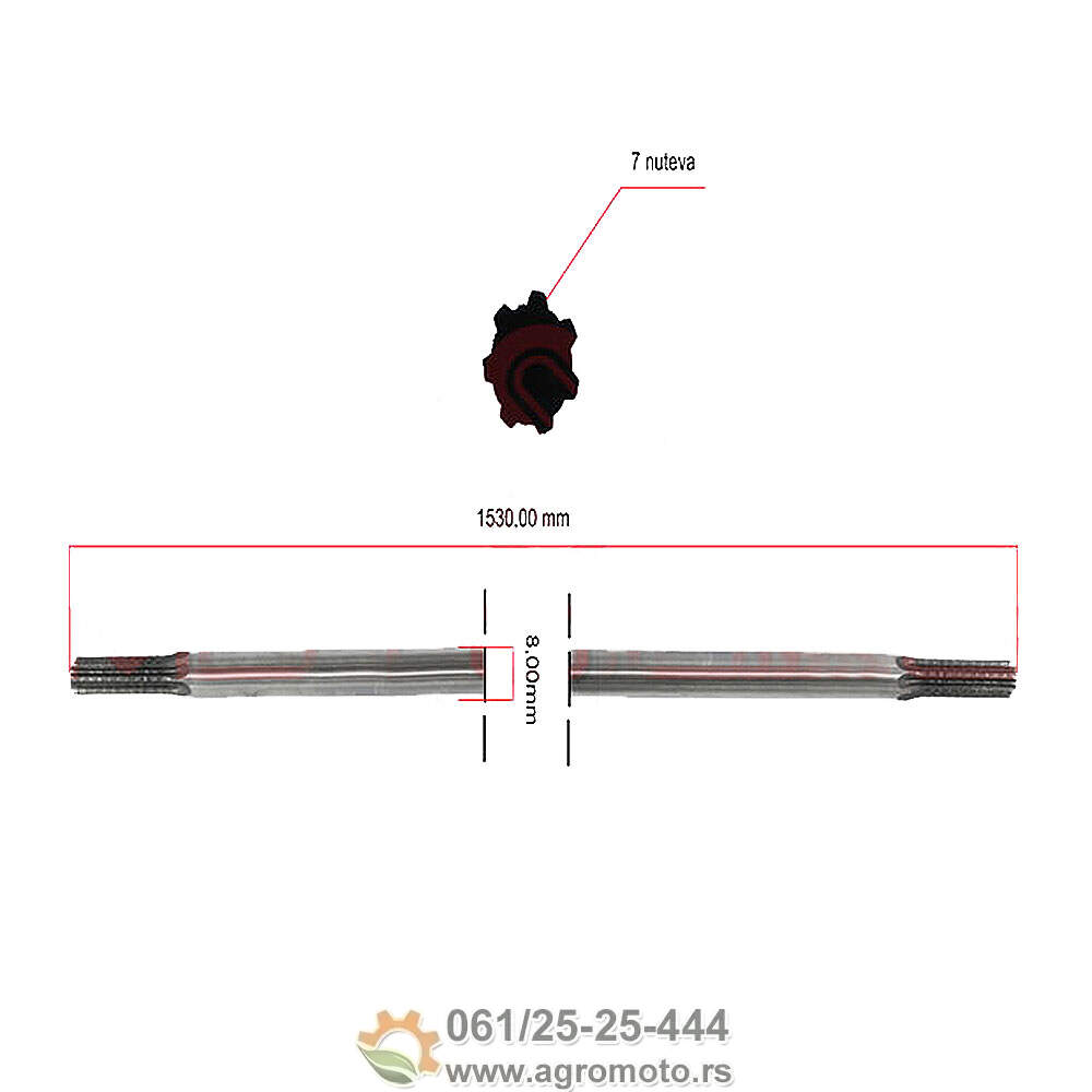 Kardan za trimer 1530x8 mm 7 nuteva je kruta prenosna osovina (vratilo) koja služi za prenos snage od motora do ugaonog prenosa (glave) trimera. Ova osovina je ključni deo pogonskog sistema i mora biti izrađena od visokokvalitetnog čelika kako bi izdržala torzione sile i vibracije pri velikim brzinama.