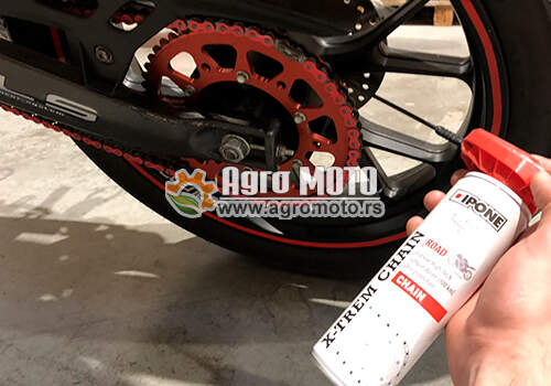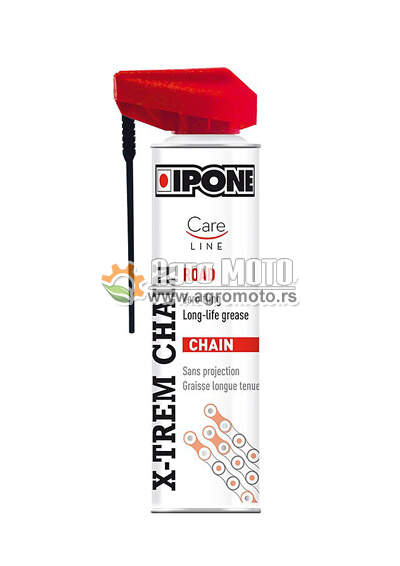 Sprej za podmazivanje lanca- X-Tream Chain Road namenjen je za sve tipove lanca O-X-Z (ring) na motociklima. Sastav formule Ipone X-Tream Chain Road je baziran na masti sa kalcijum sulfatom i aditivima koji garantuju smanjenje trenja i gubitak snage. Dizajniran je tako da se zadržava na lancu pri velikim brzinama i visokim temperaturama. Otporan je na vodu, sprečava stvaranje korozije. Upotrebom spreja smanjuje se istezanje i produžava radni vek lanca i lančanika. Podesiva mlaznica obezbeđuje precizno nanošenje spreja. Ima visoku otpornost u ekstremnim uslovima a na lancu se zadržava i do 800 km.