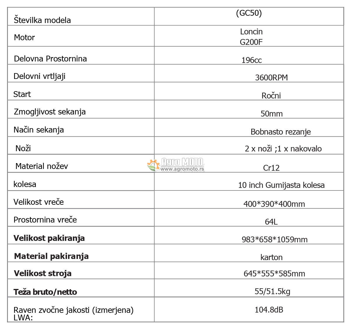 Drobilica za grane GC50 je snažna i pouzdana mašina, idealna za sve vaše potrebe drobljenja biljnih otpadaka. Opremljena je profesionalnim motorom marke Loncin sa unutrašnjim sagorevanjem, što joj omogućava da efikasno obrađuje veće količine rastlinskih ostataka. Sa snagom od 6,5 konjskih snaga i zapreminom motora od 196 kubičnih centimetara, ova drobilica je sposobna da drobi grane prečnika do 5 cm, što je čini savršenom za održavanje bašte i dvorišta.